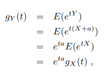 X가 discrete r.v.이고 Y가 X+a (a = constant)라면 m.g.f of Y gy(t)는 다음이 성립한다.