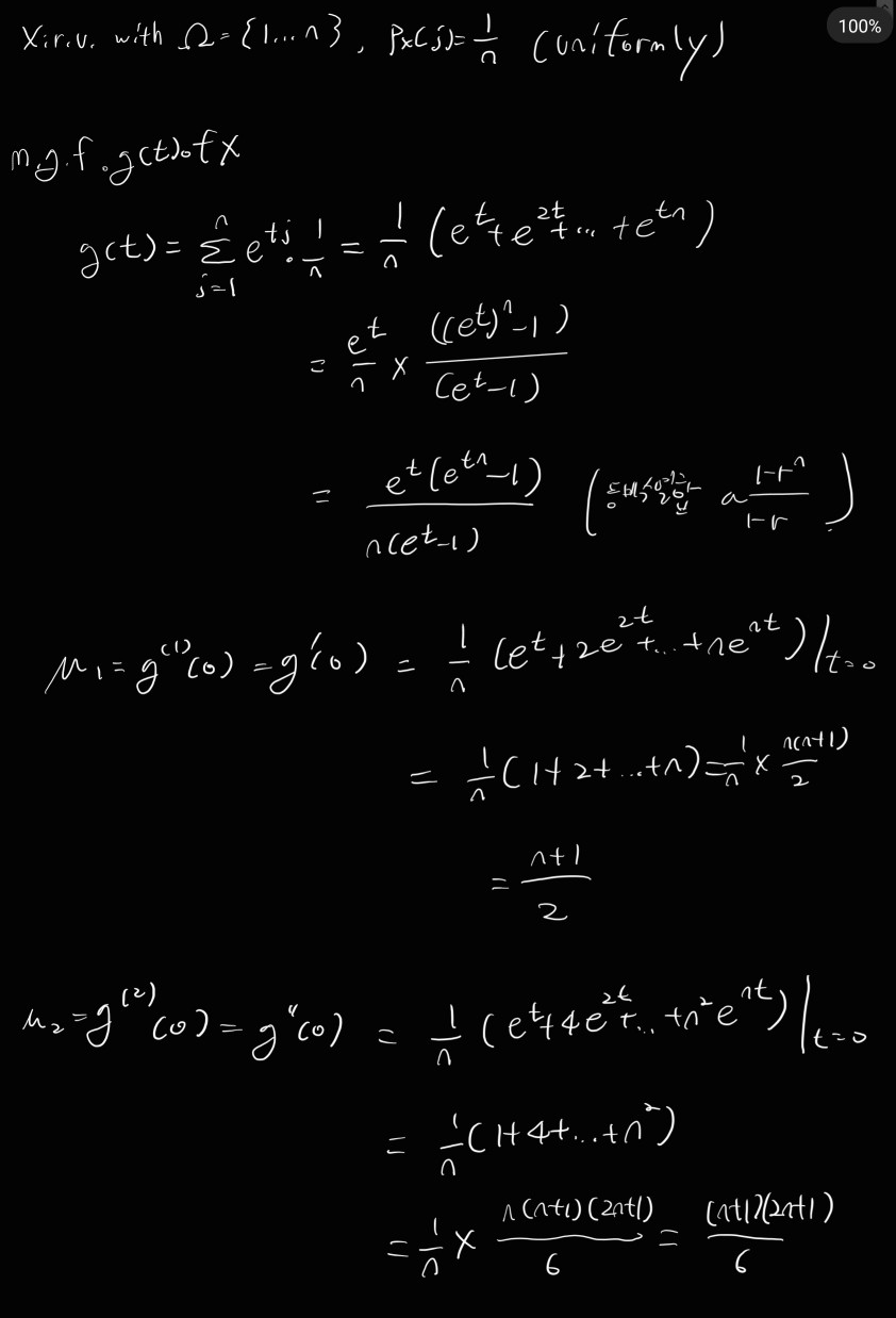 X가 유한한 Sample Space의 discrete r.v.이고 moments µk = E(X^k) 이면, 다음의 정리가 모든 t에 대해 수렴한다.
