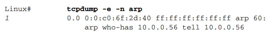 ARP Request 필드를 보면, 송신자 프로토콜 주소와 수신자 프로토콜 주소가 10.0.0.56으로 동일하다. 또한 이더넷 헤더의 소스 주소 필드 0:0:c0:6f:2d:40은 송신자의 하드웨어 주소와 동일하다. Gratuitous ARP는 다음 2가지 목표를 설정한다.