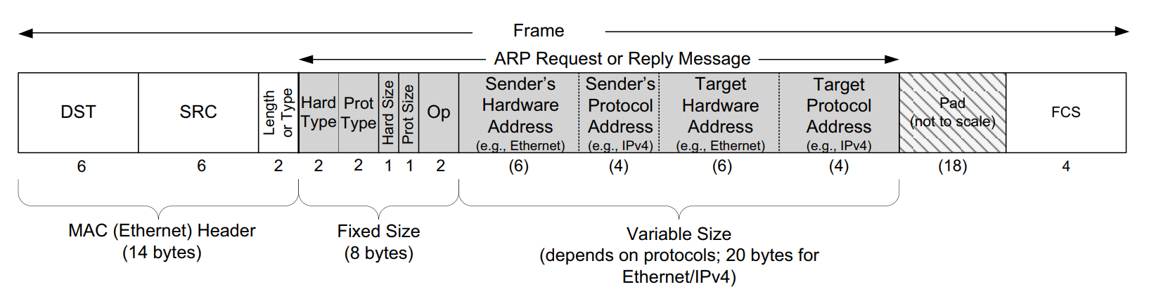 상단의 그림은 IPv4 주소를 해석하기 위해 이더넷 네트워크에서 사용되는 ARP request와 reply 패킷의 형식이다. (엄밀히 이야기하면 ARP는 IPv4 주소 이외에도 다른 주소와 사용이 가능하지만 사실상 사용되지 않는다.)