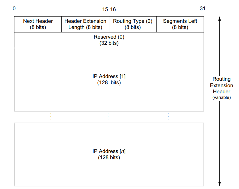 이 헤더에는 8비트 Routing Type(0) 식별자와 Segments Left 필드가 포함되어있다. IPv6 주소의 경우 RoutingType 식별자는 RH0에서 0, RH2에서 2가 들어간다. Segments Left 필드에는 처리해야 할 경로 세그먼트 수를 나타낸다. 주소 블록은 송신자는 0, 수신자는 무시하는 32비트 0으로 시작한다. 이 블록에 포함된 주소는 데이터그램이 전달되는 동안 방문해야 할 non-multicast IPv6 address들 이다. Routing 헤더는 IPv6 헤더의 Destination IP Address 필드에 포함된 주소와 일치하는 노드에 도착하기 이전에는 처리되지 않는다. 처리될 노드에 도착하면 Segments Left 필드를 사용하여 주소 벡터에서 다음 홉 주소를 결정하고, 이 주소를 IPv6 헤더의 Destination IP Address 필드와 교체한다.