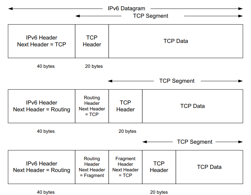 각 IPv6 헤더의 Next Header 필드는 다음 헤더의 종류를 명시하는 부분이다. 이는 IPv6 확장 헤더일 수도 있고, 바로 상위 계층 헤더로 이어질 수도 있다.