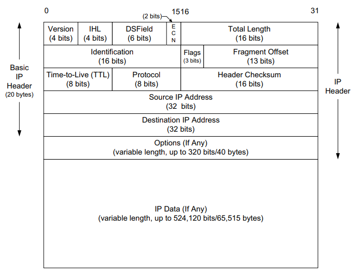 IHL 필드는 Internet Header Length field이고 IPv4 header의 32비트 단위 워드 수를 나타낸다. 4비트 크기이므로 32비트 워드 기준 최대 15*4 = 60 바이트 까지 IPv4 header의 길이를 설정할 수 있다. IPv6는 헤더 길이 40바이트로 고정이므로 해당 필드가 필요없다. 이후 6비트를 Differentiated Services 필드, 2비트를 Explicit Congestion Notification(ECN) 필드로 할당한다. 이 필드들은 datagram이 전달될 때 특별한 처리를 위해 사용된다.
