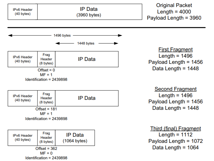 각 단편의 Length 부분에는 자신의 길이만 들어가게 된다. 또한 단편화 불가능한 부분 뒤에, 적절히 할당된 Fragment Offset 필드를 가진 Fragment 헤더와 원래 패킷의 Identification 필드를 가진다.