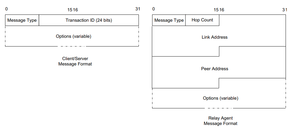 DHCPv6 메시지는 UDP/IPv6 데이터그램으로 캡슐화된다. 메시지는 호스트의 link-scoped source address를 사용하여 릴레이 에이전트 또는 서버로 전송된다. DHCPv6 메시지는 2가지 형식이 있다. 하나는 C/S가 다이렉트로 연결되는 경우고 하나는 Relay Agent를 통해 연결이 될 때이다. Link Address 필드는 클라이언트가 위치한 링크를 식별하기 위해 사용하는 글로벌 IPv6 주소이고 Peer Address 필드는 릴레이가 전달할 메시지를 수신한 클라이언트 또는 릴레이 에이전트 주소를 포함한다. 릴레이는 체인 형태로 연결될 수 있으며 하나의 릴레이가 다른 릴레이로부터 받은 메시지를 다시 전달할 수 있다. DHCPv4와 v6의 주요 차이점은 DHCPv6가 IPv6 멀티캐스트 주소를 사용하는 방식이다. 클라이언트는 Request 메세지를 모든 서버에 추가로 DHCP Relay agent에게까지 보낸다.