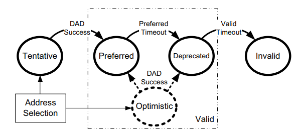 주소가 처음 선택되어 사용되기 시작할 때, Tentative state 또는 Optimistic state에 진입한다. 임시 상태에서는 해당 주소가 NDP를 위해서만 사용될 수 있으며, 다른 용도로는 Source, Destination Addr.로 사용되지 않는다. 이 상태에서는 같은 네트워크의 다른 노드와 주소 중복 여부를 검사한다. 이 절차를 DAD라고 하며 DAD가 성공하면 Preferred 단계로 이행된다.