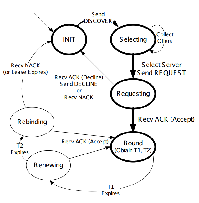 그림을 보면 클라이언트는 정보가 없는 상태에서 INIT으로 시작, DISCOVER 메시지를 전송한다. Selecting 상태에서는 DHCPOFFER를 수집하며 선택이 완료되면 서버를 고르고 REQUEST를 전송한다. 이 시점에서 원하는 주소를 찾지 못하면 DECLINE 전송 후 INIT 상태로 돌아간다. 만약 찾았다면 ACK로 IP 주소 사용을 허가하고 Bound 상태로 들어가 주어진 시간 동안 주소를 사용한다. 갱신 기간(T1)이 끝났다면 기존 서버에 갱신 시도를 하고 T1 동안 갱신에 실패하면 재결합 시간 T2에 들어가 다른 DHCP 서버에도 갱신 시도를 한다. 만약 실패한다면 INIT 단계로 돌아온다.