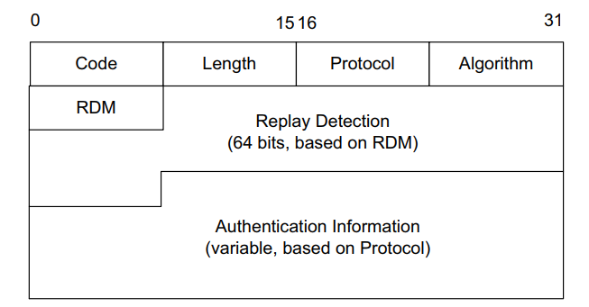 Authentication option의 목적은 DHCP 메시지가 검증된 소스로부터 온 것인지를 확인하는 데 있다.Code는 90으로 설정되며 Length 필드는 옵션의 바이트 수를 나타낸다. Protocol 및 Algorithm 필드의 값이 0일 경우 Authentication Info. 필드는 단순한 shared configuration token을 포함한다. 클라이언트와 서버에서 이 token이 일치하면 메시지가 수락된다. (비밀번호) 그러나 이러한 트래픽은 공격자에 의해 탈취당하기 쉬워 안전하지 않다. (실수로 발생하는 DHCP 문제는 방지 가능.)