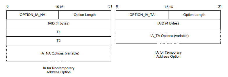 요청에 응답할 때 서버는 서버 관리자에 의해 결정된 Address Assign Policy Set에 따라 클라이언트의 IA에 하나 이상의 주소를 할당한다. 비임시 주소와 임시 주소를 위한 IA 옵션 형식은 상단의 그림과 같다. 해당 그림을 보면 임시주소와 비임시 주소는 T1,T2 포함 여부가 차이난단 것을 알 수 있다. 임시 주소에 T1, T2를 포함하지 않는 이유는 일반적으로 이전에 획득된 비임시 주소의 T1, T2 값을 기반으로 결정되기 때문이다.