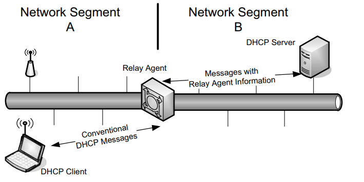 relay agent는 DHCP의 동작을 여러 네트워크 세그먼트에 걸쳐 확장하는 데 사용된다. 상단 그림에서 A,B 네트워크 세그먼트 사이의 릴레이는 DHCP 메시지를 전달하며, 옵션을 사용하거나 빈 필드를 채워 메시지에 추가 정보를 주석으로 삽입할 수 있다. 일반적인 상황에서 relay agent는 클라이언트와 서버 간에 교환되는 모든 DHCP 트래픽에 참여하지 않는다. 대신 브로드캐스트로 전송되는 메시지(보통 첫 주소 획득 절차)만을 릴레이한다. 클라이언트가 IP 주소와 Server Identification 옵션을 사용해 서버의 IP 주소를 획득한 후에는 릴레이가 관여하지 않고 서버와 직접 Unicast 통신이 가능해진다. 전통적으로 Relay agent는 layer 3 device로 작동해야하며 라우팅 기능을 포함하는 경향이 있다. (layer 2 device로도 제한적으로 작동이 가능하다.)