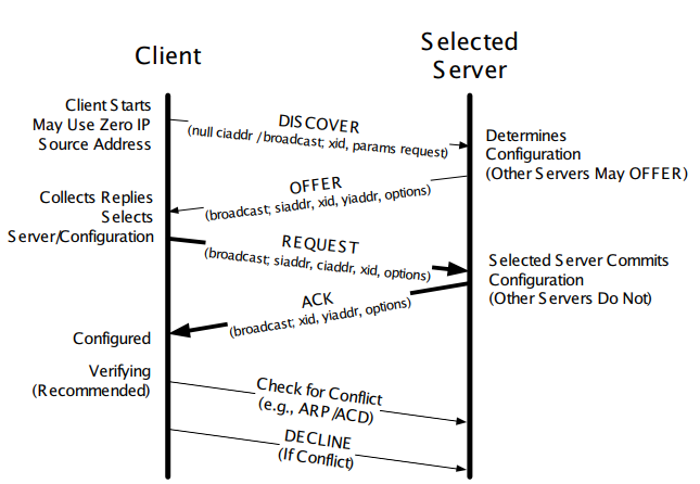 클라이언트가 DHCPACK 메시지와 관련 구성 정보를 수신했으면, 제공된 주소가 이미 사용 중이지 않은지 확인하기 위해 네트워크를 탐색한다. 예를 들어 ARP Request를 하여 충돌 탐지를 수행한다. 만약 충돌 시 DECLINE 메시지를 서버에 보내 해당 주소를 사용할 수 없음을 알린다.