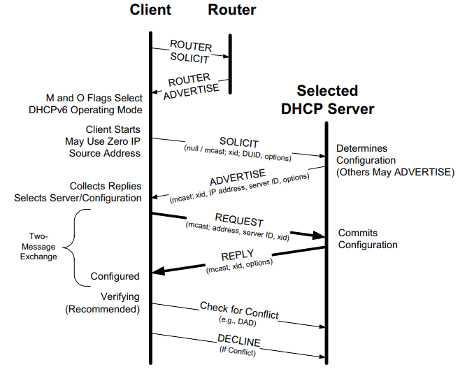 일반적으로 클라이언트는 먼저 사용할 Link-Local address를 결정한 후 ICMP Router Discovery를 수행하여 연결된 네트워크에 라우터가 있는지 확인한다. DHCPv6가 사용 중인 경우, 최소한 M 비트 필드가 설정되며 클라이언트는 DHCPSOLICIT 메시지를 multicast하여 DHCPv6 서버를 찾는다. 이에 대한 응답으로 하나 이상의 DHCPADVERTISE 메시지가 전송된다.