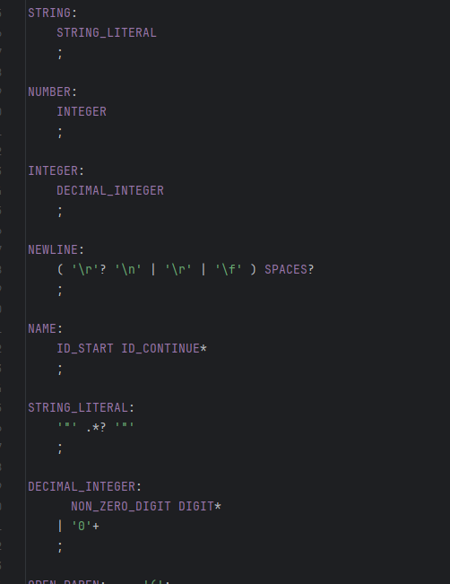 이 규칙들을 유심히 보자. 과연 ANTLR가 자동 생성한 tinyPythonBaseListener에 enterSTRING라던가 enterNUMBER 같은 함수가 존재할까?