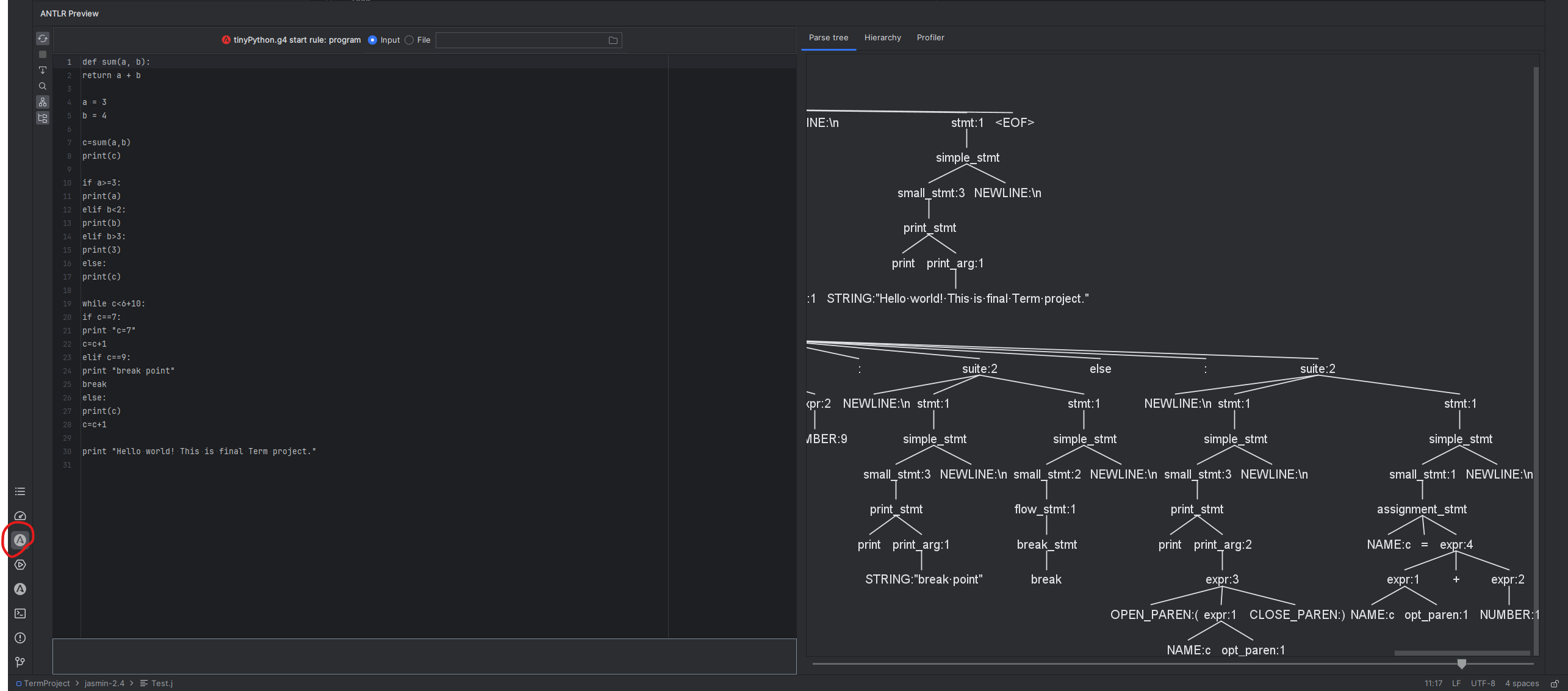 ANTLR plugin을 설치했다면 해당 탭에서 g4 rule을 선택해주고 가지고 있는 tpy 파일을 입력해주면 Parse tree가 생성된다.