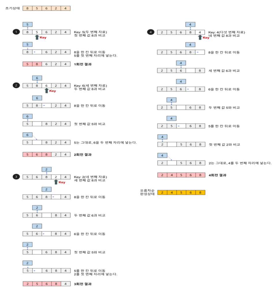 삽입정렬은 2 번째 값부터 시작해서 그 앞에 존재하는 원소들과 비교하여 삽입할 위치를 찾아 삽입하는 알고리즘이다.