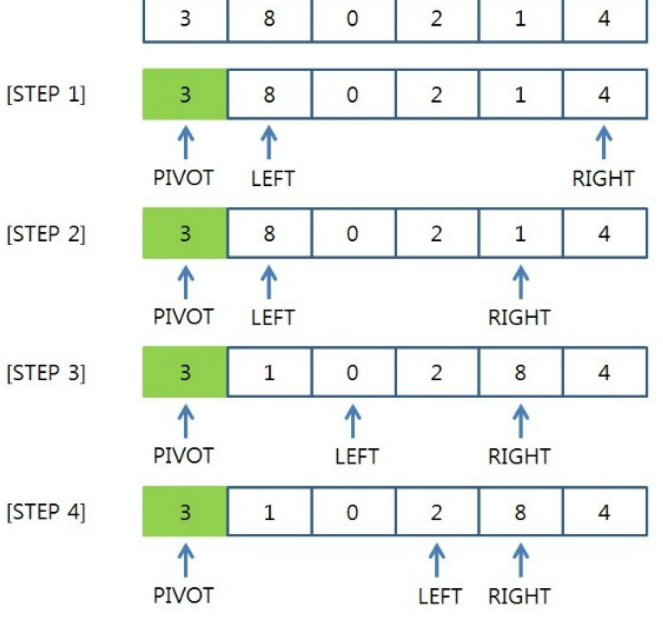 Divide & Conquer 중 하나로 리스트를 비균등하게 분할한다. 피봇을 선택하고(선택법엔 여러가지가 있다.) Left, Right 포인터를 설정한다.
