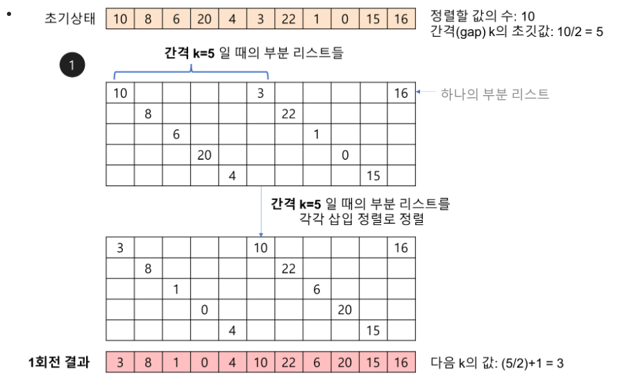 간격 k로 배열을 끊으면 부분 리스트들이 생긴다. 해당 부분 리스트 들을 간격이 1이 될 때까지 줄여가면서 각각 삽입 정렬