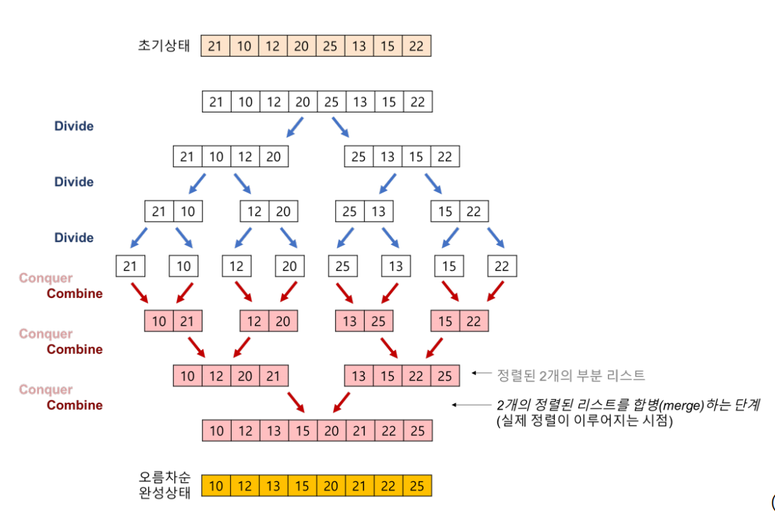 - 주어진 문제를 풀기 위해서 문제를 여러개의 하위 문제로 나누어 푼 다음, 그것을 결합하여 해결하는 방식.