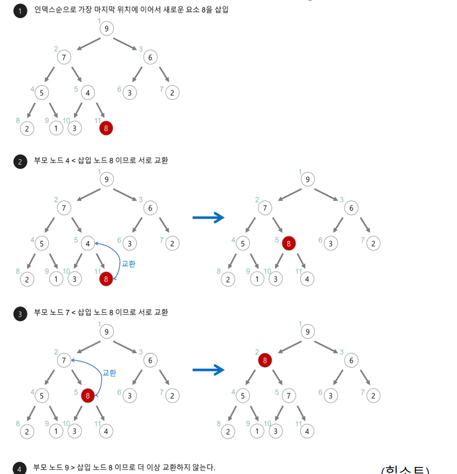 이러한 힙의 구조에서 root를 뽑아내고 다시 힙으로 만들고를 반복하면 정렬된 순서의 데이터를 얻을 수 있다.